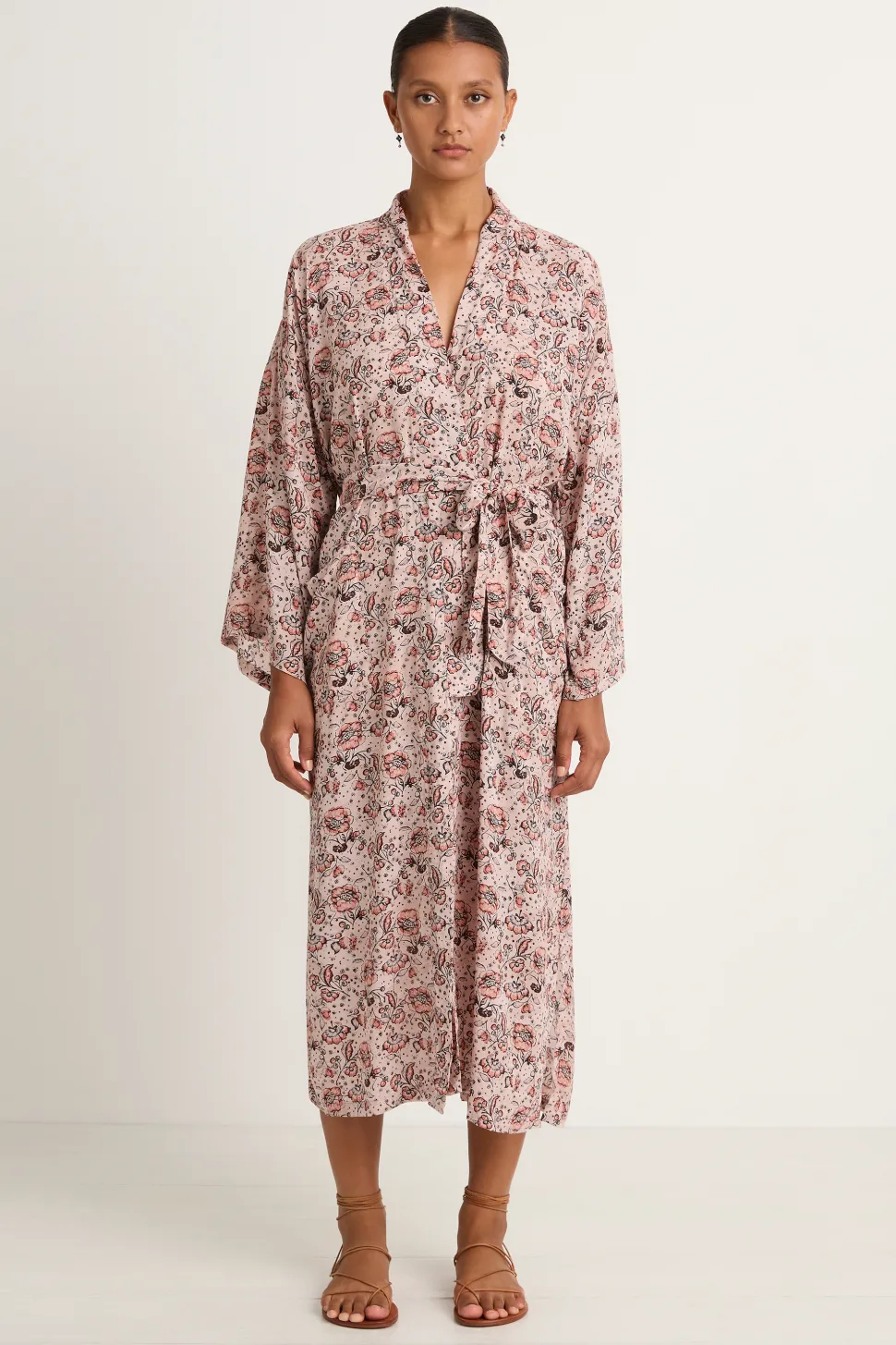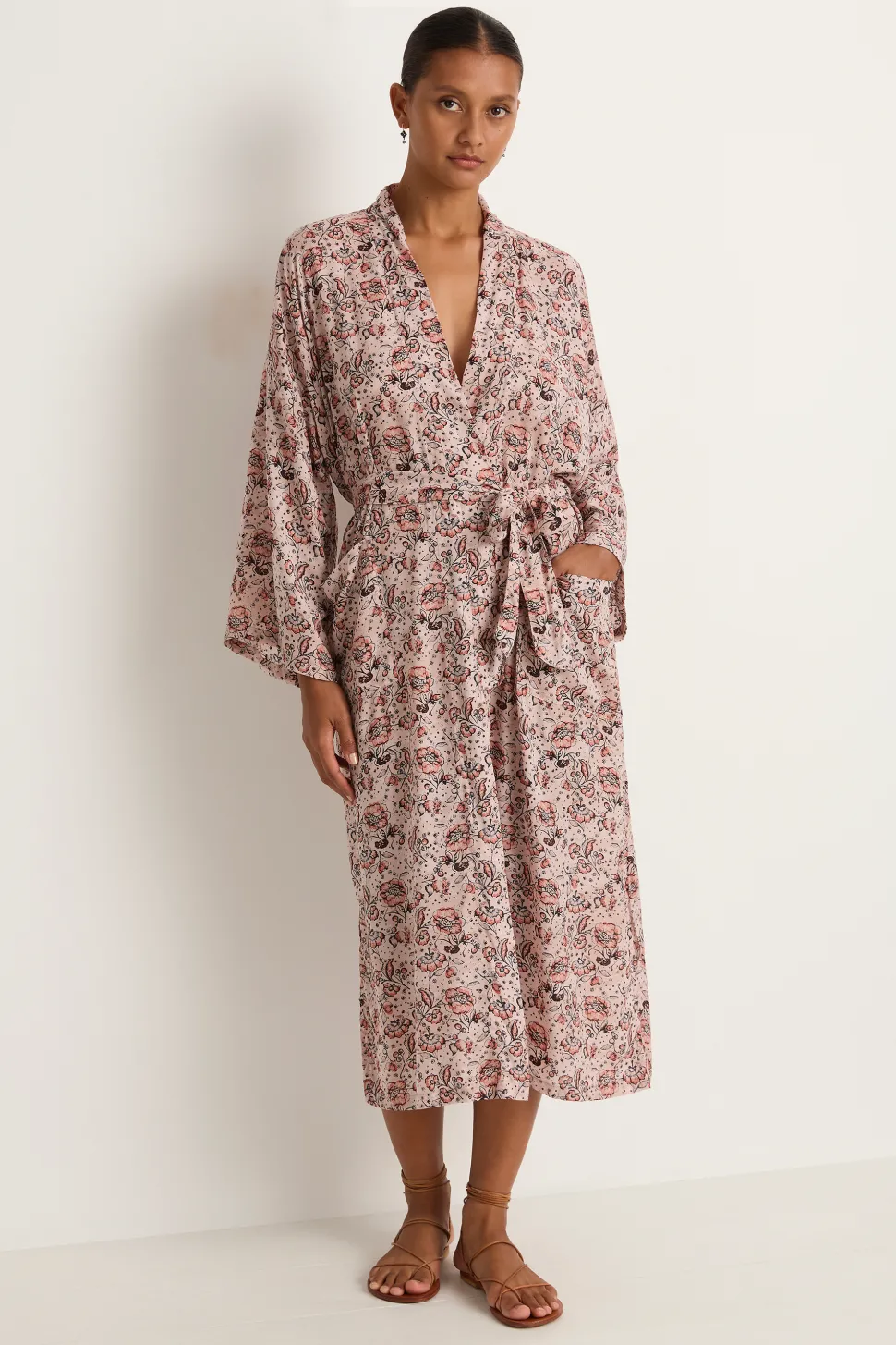 Perfect as a cover up or loungewear, the Diane smoking jacket features drop shoulders, full sleeves, two over sized pockets and side slits. Matching sash tie belt included.