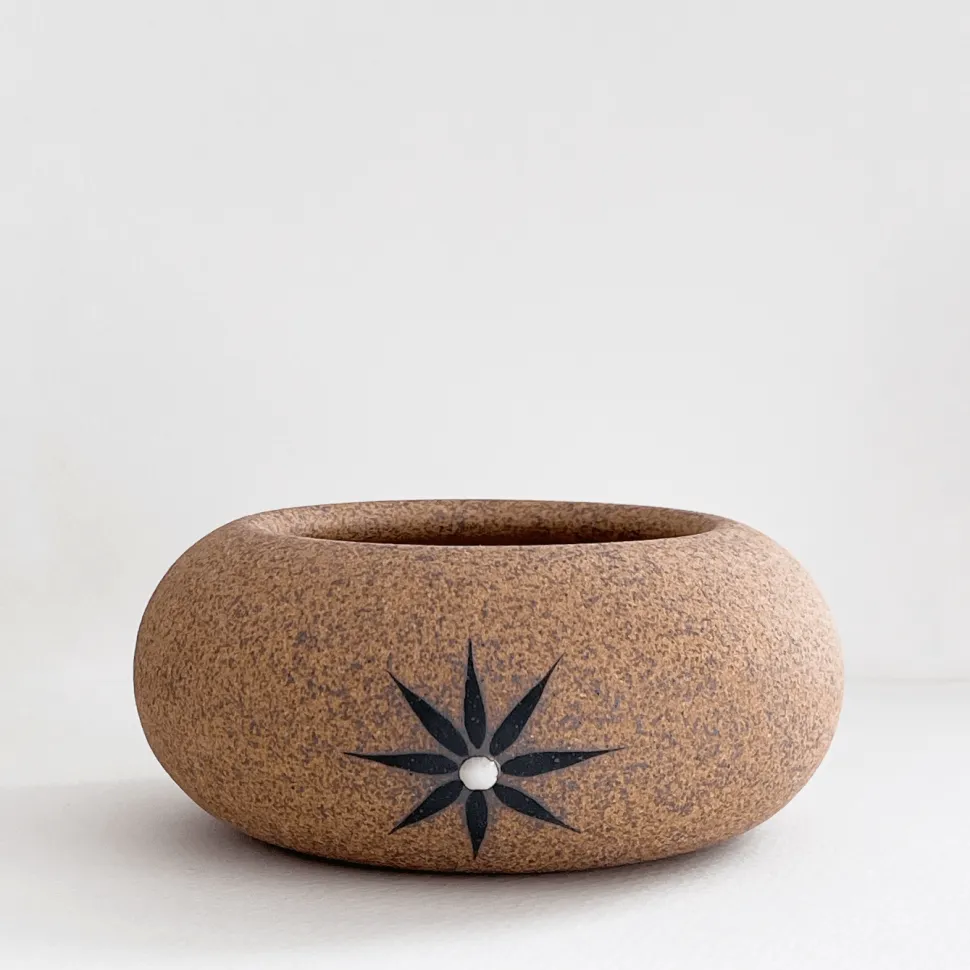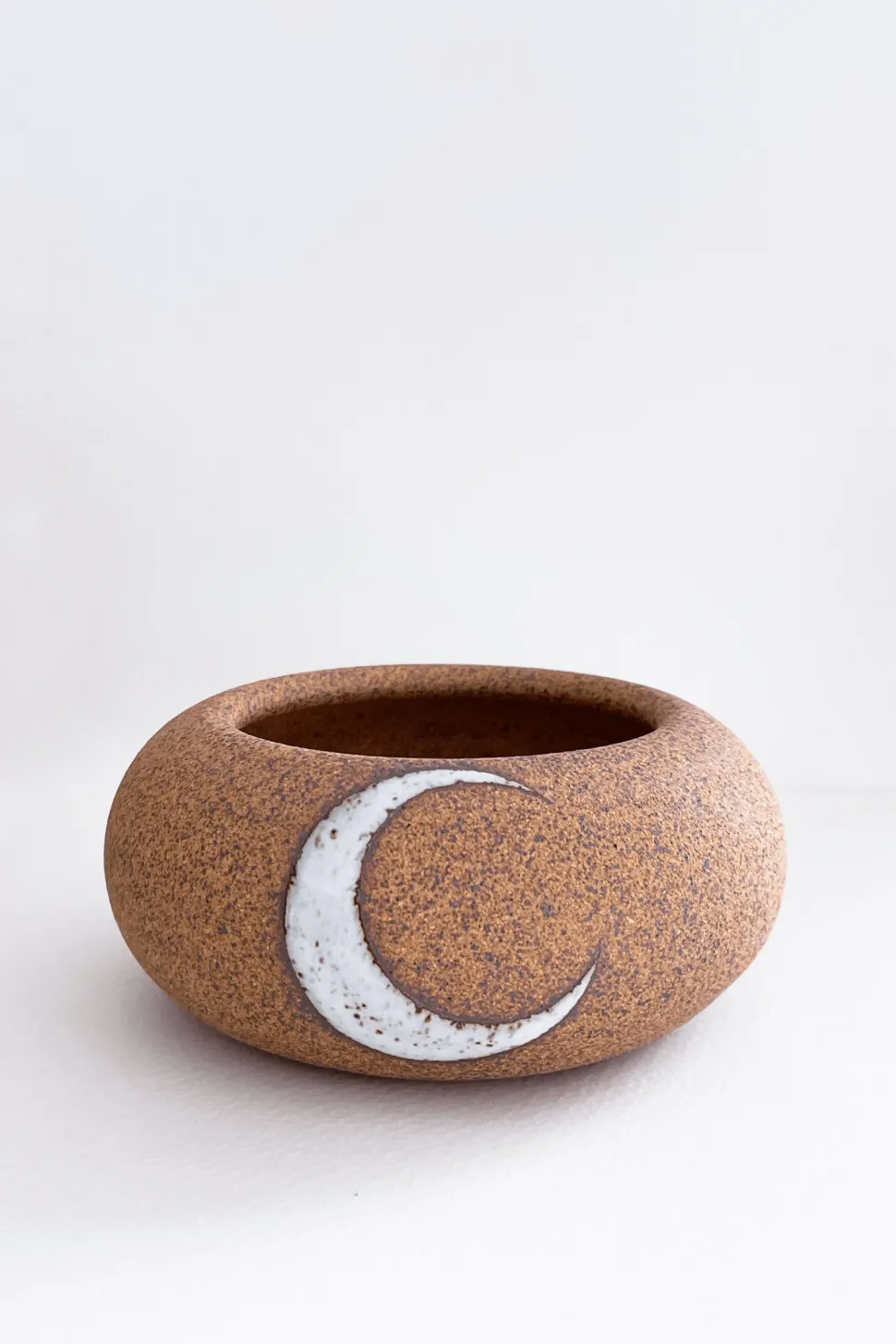 Fill with sand and add a votive candle. This XS Rock Vessel in Tucker stoneware is painted with a white glaze crescent moon and a black star.